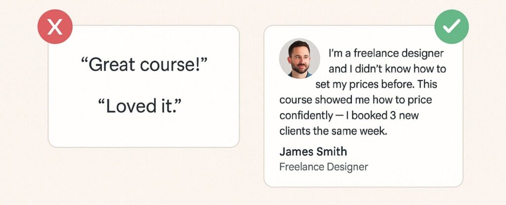 Generic testimonials like “Great course!” or “Loved it!” don’t help new visitors trust your offer. They’re too vague and don’t explain why someone should buy from you.