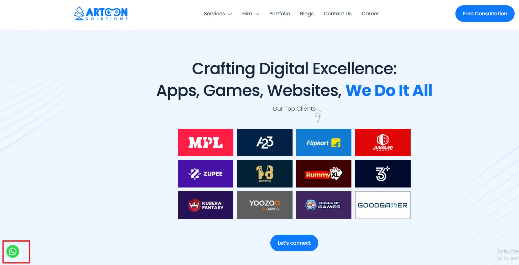 Instead of a callback form, Artoon uses a floating WhatsApp icon in the bottom left.