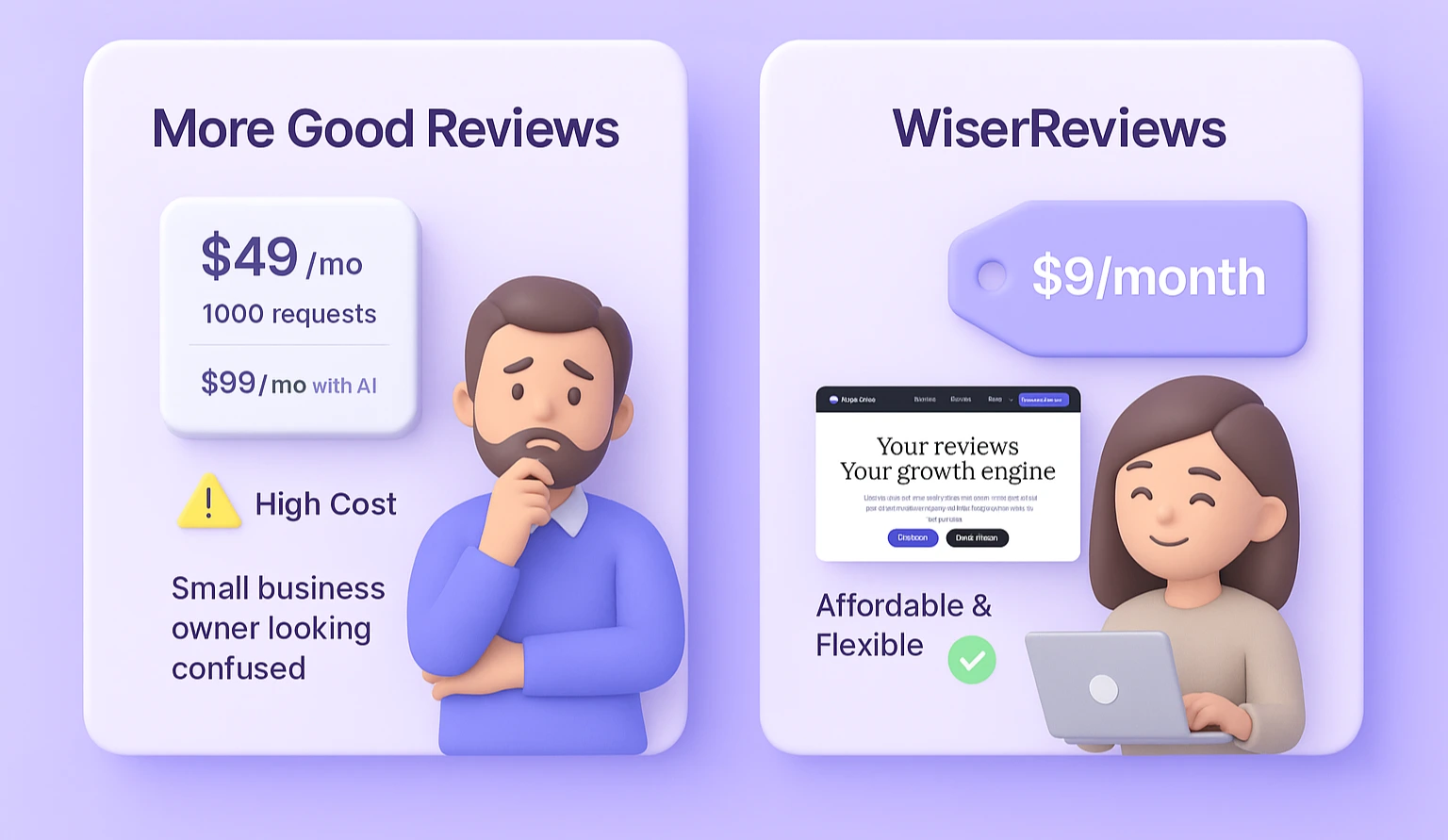 While More Good Reviews offers basic reputation management, WiserReviews gives you more control, faster setup, and richer features at a lower cost.