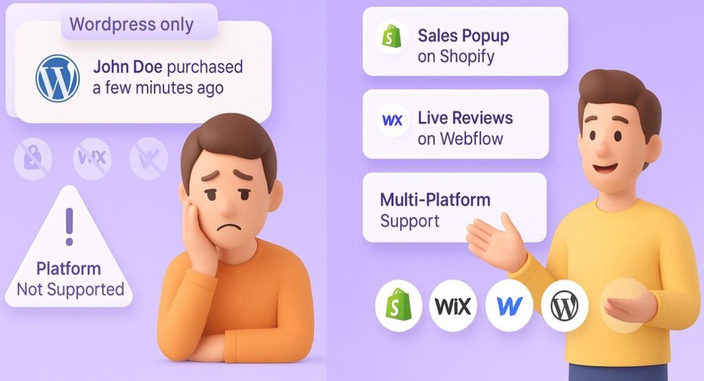 NotificationX works well for WordPress, but it’s limited to that platform. If you use other platforms like Shopify, Wix, or Webflow, you’ll need alternatives that offer cross-platform support and more customization options.