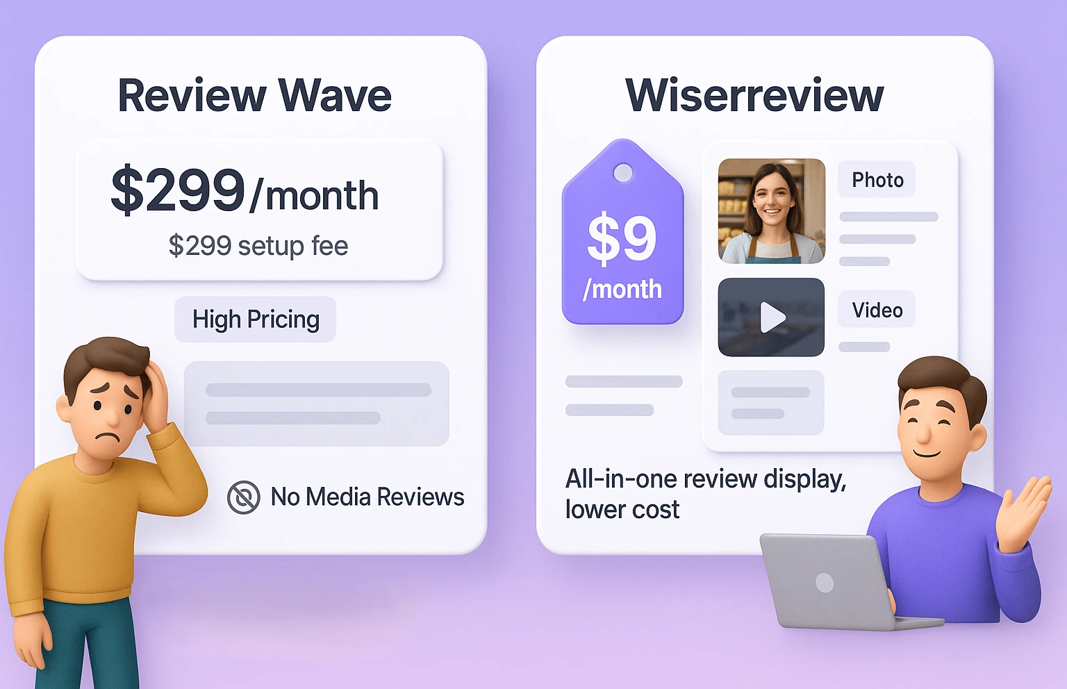Starts at $9/month: WiserReviews is a fraction of the cost. Review Wave starts at $299/month plus a setup fee.