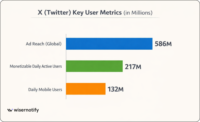 This metric shows the overall size of X’s global audience. Since the company no longer releases regular monthly user reports, advertising reach data helps estimate how many people use the platform worldwide.