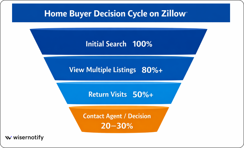 Zillow users take time before making a decision. They track home values, price cuts, and market changes before contacting agents or making offers.