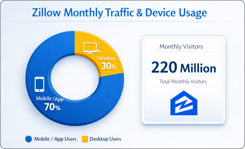 2. Over 70% of users access Zillow through mobile apps and devices, showing strong app usage.