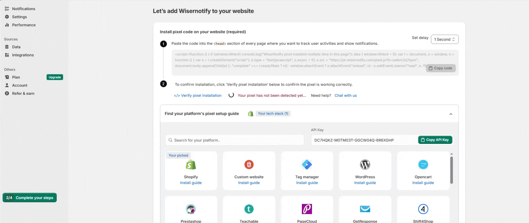 - After login in, WiserNotify will prompt you to install the pixel code.